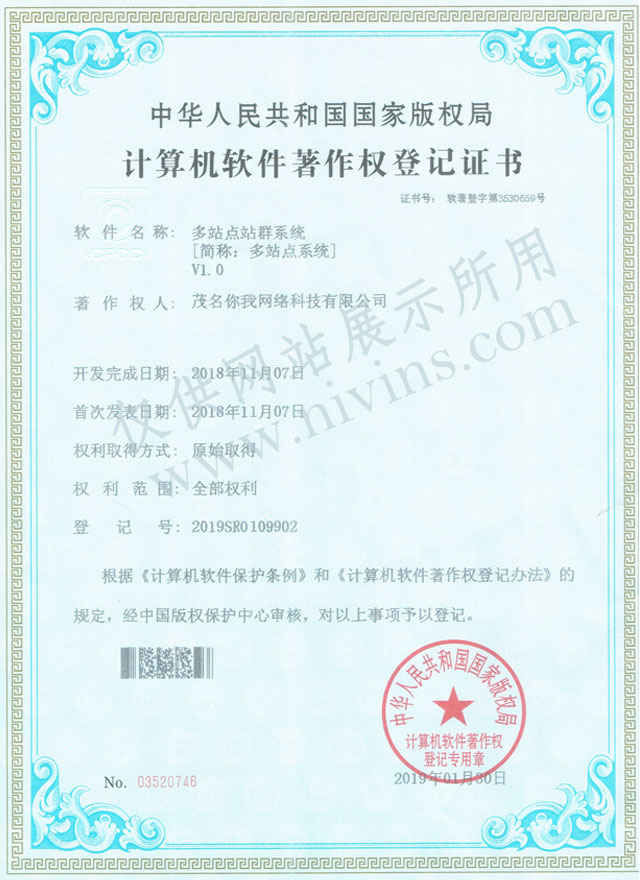 熱烈祝賀茂名你我網(wǎng)絡科技有限公司獲得了中華人民共和國國家版權局頒發(fā)的《計算機軟件著作權登記證書》,被認定為軟件——“多站點站群系統(tǒng)V1.0”的法定著作權人,登記號:2019SR0109902,證書號:軟著登字第3530659號。